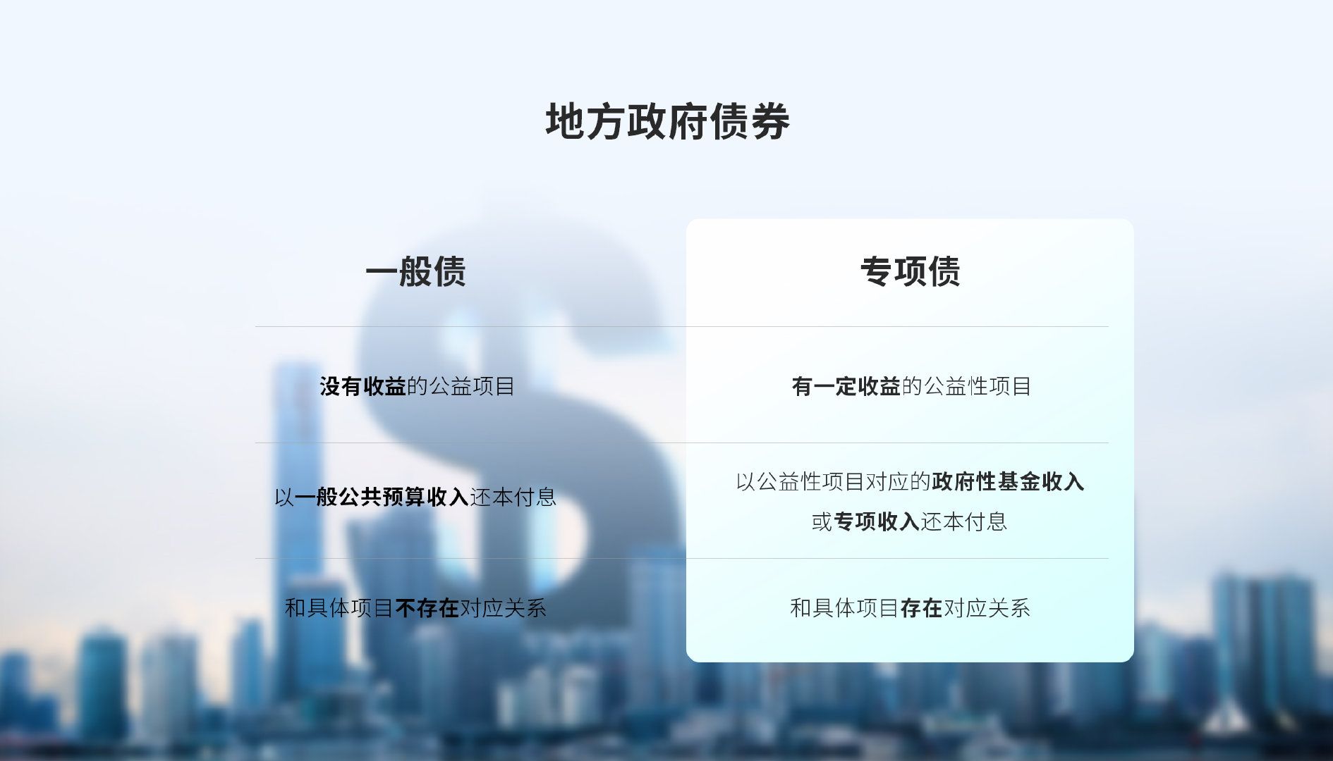 而專項(xiàng)債只能用于有一定收益的公益性項(xiàng)目,以項(xiàng)目對(duì)應(yīng)的政府性基金收入或?qū)m?xiàng)收入還本付息,和具體項(xiàng)目存在著對(duì)應(yīng)的關(guān)系,即,每一個(gè)項(xiàng)目都有所不同,不能生搬硬套,是需要具體問題具體分析的。