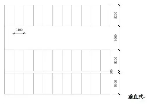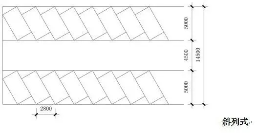 根據(jù)地形條件以占地面積小、疏散方便、保證安全為原則,主要停車方式有平行式、斜列式、垂直式三種。其中間最小距離以小型車為例,停車方式見下圖
