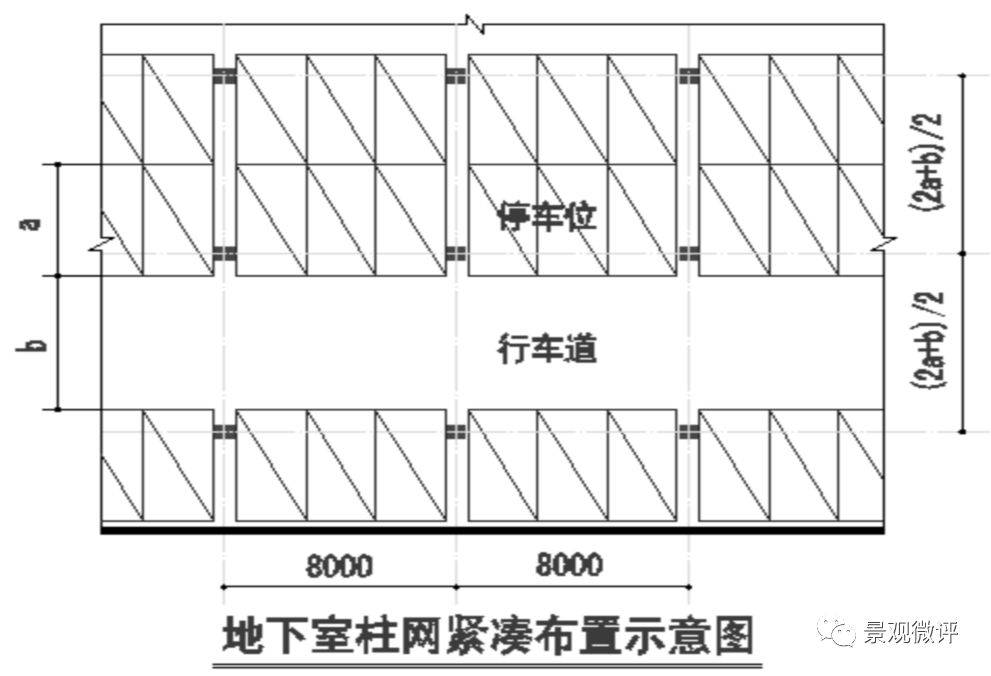 柱網:柱網按7800~8400x(2a+b)/2布置。以橫向停3輛車為例,垂直行車道方向柱(2a+b)/2,其中:a為停車位深度,b為行車道寬度。