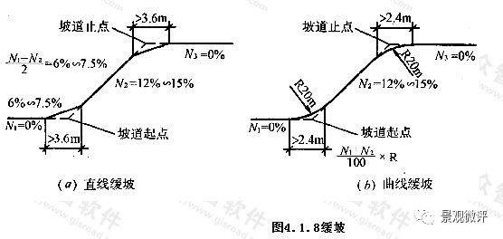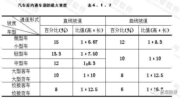 汽車庫內當通車道縱向坡度大于10%時,坡道上、下端均應設緩坡。其直線緩坡段的水平長度不應小于3.6m,緩坡坡度應為坡道坡度的1/2。曲線緩坡段的水平長度不應小于2.4m,曲線的半徑不應小于20m,緩坡段的中點為坡道原起點或止點。