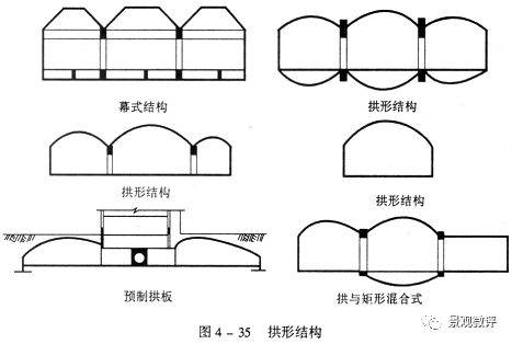 拱形結構有單跨、多跨、幕式及拋物線拱、頂制拱板等多種類型